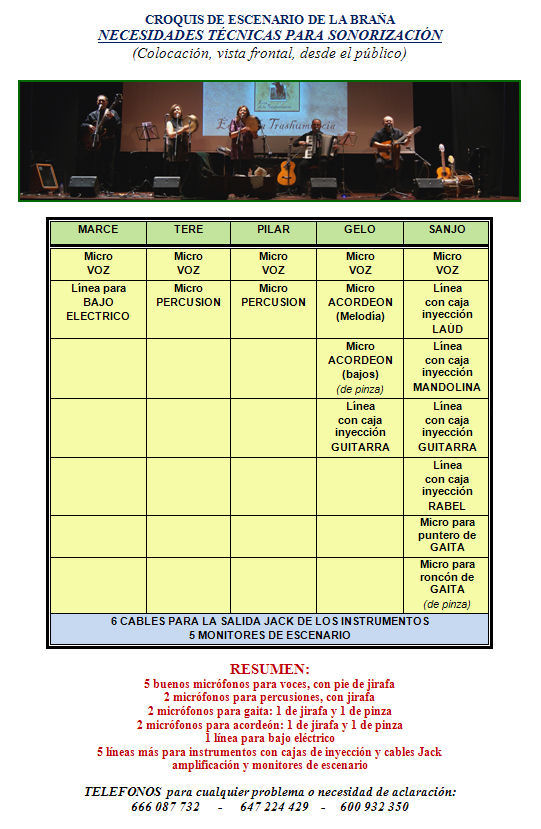 Para contratar un concierto de "La Braña", lo mejor es ponerse en contacto directo con nosotros, a través de los teléfonos o del correo electrónico y ajustar convenientemente las condiciones de lugar, fecha y hora, caché, etc. La entidad contratante necesitará aportar el escenario y la toma de corriente, quedando todos los demás aspectos (equipo de sonido, viajes, comidas...) a cargo del grupo. Si la actuación fuera lejos de León, o fuese una actuación compartida con otros grupos, puede ser conveniente que la organización contrate por su cuenta un equipo profesional de sonido a una empresa especializada, de acuerdo con las necesidades técnicas del concierto.