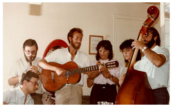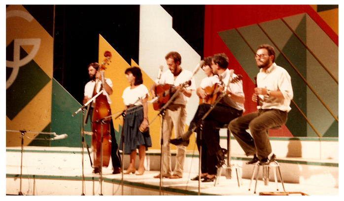 | Una de las varias ocasiones en que el grupo "La Braña" apareció como artista invitado en el programa "Gente Joven". Fue una importante experiencia, y les debemos un agradecimiento especial a Fernando Juan Santos y a Rafael Cavero por todos sus detalles y atenciones con nosotros. La fotografía de arriba recoge un momento de la grabación del programa que se emitió el 23 de octubre de 1983 en TVE1. En la foto inferior, el ensayo en los camerinos de RTVE, esperando el momento de salir a escena.
