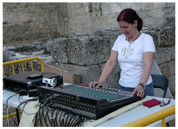Mari Jose, además de esposa de Marce, fue durante muchos años el técnico de sonido de "La Braña", y todavía ejerce como tal en ocasiones especiales. Además es la reportera gráfica que va siempre con nosotros, (lo mismo actuaciones que ensayos), atiende a los que demandan nuestros discos en los conciertos, etc. En pocas palabras, es una amiga inseparable y forma parte imprescindible de nuestro equipo. Aquí la vemos al control de la mesa de sonido durante un concierto .
