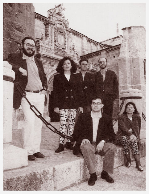 Ciriaco Vicente Castro fue uno de los fotógrafos que nos hicieron excelentes reportajes fotográficos. La fotografía que aparece aquí arriba sirvió para realizar una serie de carteles y fue la imagen que anunció mediante tarjetas en blanco y negro el "Concierto por ASPRONA" en la Plaza de San Isidoro el 20 de junio de 1992. 18 años más tarde, Camino y Gustavo nos hicieron una foto casi en el mismo lugar. El grupo es ahora un quinteto, la mañana estaba más fría, los chicos tienen menos pelo. El resto, como se puede apreciar... es idéntico. |