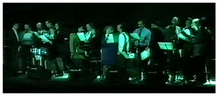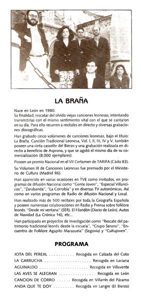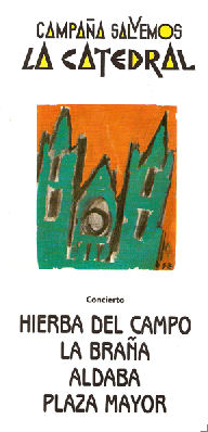El 27 de diciembre de 1992, "La Braña", "Plaza Mayor", "Hierba del Campo" y "Aldaba", los cuatro grupos folk que por entonces tenía la ciudad de León, se reunieron en un recital que la prensa calificó de "histórico e inédito", para obtener fondos destinados a la campaña "SALVEMOS NUESTRA CATEDRAL". En la fotografía superior, los cuatro grupos cantando juntos un villancico al final del acto. Más abajo, "La Braña" en dos de las canciones que interpretó durante el festival.