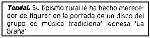 La foto de portada del disco "La Braña. Canción Tradicional Leonesa. Vol. 6" sirvió de imagen para un cartel utilizado durante varios años. Esta fotografía de Juan Antonio Velasco fue tomada al caer la tarde en un precioso rincón del pequeño pueblo de Tendal, en la comarca de La Sobarriba. En el coleccionable "Tierras de León", que se publicó por fascículos en el periódico "La Crónica de León" se cita: