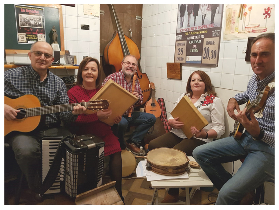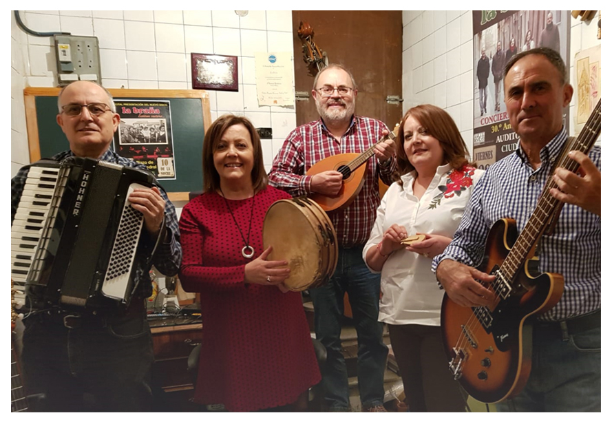 El grupo "La Braña" en su local de ensayo, rodeados de instrumentos, carteles, trofeos y otros recuerdos. En la pared puede verse el primer boceto de escenario dibujado por la propia mano de Velasco. Arrimado a la puerta, el contrabajo utilizado por el grupo durante muchos años. En una repisa junto a la pizarra, el trofeo "Guzmán el Bueno" conseguido en el Certamen de Música Folk de Tarifa.