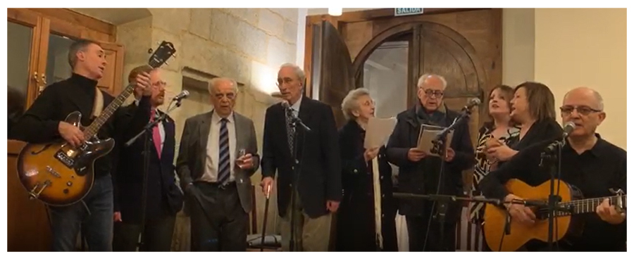 Además de los componentes de La Braña, podemos ver en esta imagen, de izquierda a derecha, a César Dopazo, Manuel Núñez, Cándido Alonso, Margarita Morais y Samuel Rubio, que en seguida se animaron a participar de los cantares leoneses. |