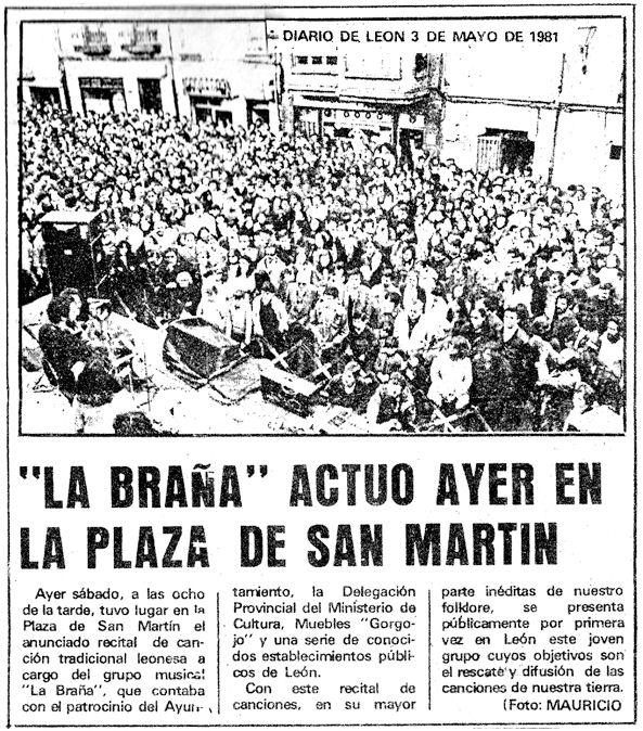 Con este recital de canciones de nuestro folklore, en su mayoría inéditas, se presenta por primera vez este grupo cuyos objetivos son el rescate y difusión de las canciones de nuestra tierra. Por ello, La Braña invita a esta manifestación folklórica a todas aquellas personas que deseen pasar un rato agradable, escuchando estos temas que forman parte de la cultura popular leonesa...