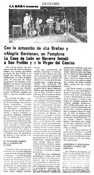 EL FOLKLORE LEONÉS EN EL PUESTO DE HONOR El domingo 23, tras una misa celebrada por el padre Cabezas -promotor de la Casa de León en Navarra- muchos leoneses y navarros acudieron al Teatro Gayarre de Pamplona para presenciar las actuaciones de los grupos "La Braña" y "Alegría Berciana", que en líneas diferentes de interpretación, aspiran a la vez a rescatar el amplio y muchas veces inédito folklore leonés.