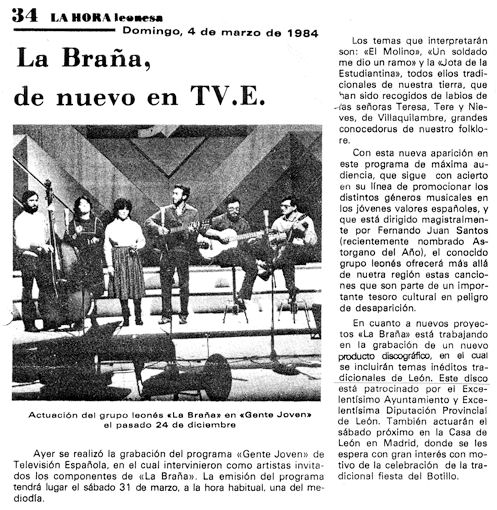 Ayer se realizó la grabación del programa "Gente Joven" de Televisión Española, en el cual intervinieron como artistas invitados los componentes de "La Braña". La emisión del programa tendrá lugar el sábado 31 de marzo, a la hora habitual, una del mediodía.