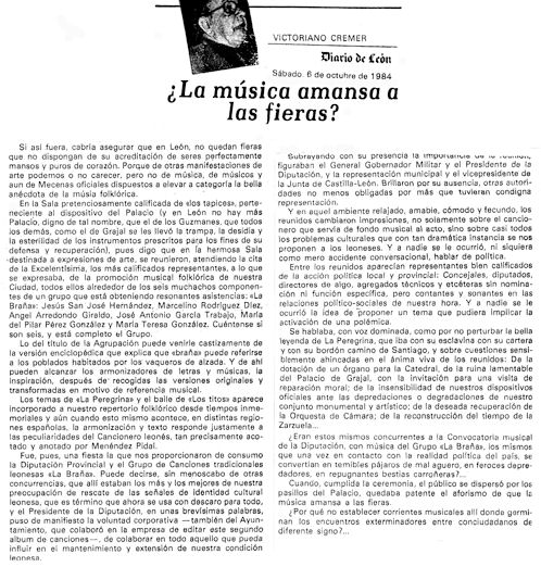 Fue, pues, una fiesta la que nos proporcionaron de consuno la Diputación Provincial y el Grupo de Canciones tradicionales leonesas "La Braña". Puede decirse, sin menoscabo de otras concurrencias, que allí estaban los más y los mejores de nuestra preocupación de rescate de las señales de identidad cultural leonesa, que es término que ahora se usa con descaro para todo, y el Presidente de la Diputación, en unas brevísimas palabras, puso de manifiesto la voluntad corporativa -también del Ayuntamiento, que colaboró en la empresa de editar este segundo álbum de canciones-, de colaborar en todo aquello que pueda influir en el mantenimiento y extensión de nuestra condición leonesa.