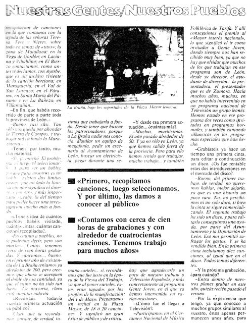 Participamos en el Certamen Nacional de Música Folklórica de Tarifa. Y allí conseguimos el premio al "Mayor interés tradicional", lo que significó el ir como invitados a Gente Joven, donde siempre nos han recibido muy bien, ya que no hay que olvidar que muchos de los que trabajan en ese programa son de León, desde su director, el ayudante de dirección... la presentadora, el presentador, que es de Zamora... Hacía muchos años, muchos, en que no había intervenido en un programa nacional de Televisión un grupo leonés. Hemos estado en ese programa dos veces como invitados en programas normales, y también cantando villancicos en los programas especiales que han hecho.