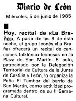 A partir de las 9 de esta noche, el grupo leonés "La Braña" ofrecerá un recital de canciones folklórico-leonesas en la Plaza de San Martín. El acto, patrocinado por la Delegación Territorial de Cultura de la Junta de Castilla y León, lo organiza la Peña El Tambor del barrio de San Martín, como actividad programada dentro de su II Semana Cultural.