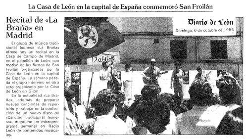 El grupo de música tradicional leonesa "La Braña" ofrece hoy un recital en la Casa de Campo de Madrid, en el Pabellón de León, con motivo de las fiestas de San Froilán organizadas por la Casa de León en la capital de España. La semana pasada, el grupo intervino en otro acto organizado por la Casa de León en Gijón.