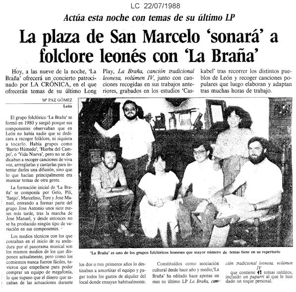 El grupo folclórico "La Braña" se formó en 1980 y surgió porque sus componentes observaban que en León no había nadie que se dedicara a recoger folklore, ni siquiera a tocarlo. Había grupos como 'Barrio Húmedo', 'Hierba del Campo', o 'Vida Nueva', pero no se dedicaban a recoger canciones de viva voz, arreglarlas y cantarlas para intentar darles una difusión, sino que lo que hacían principalmente era musicar temas de otra gente.