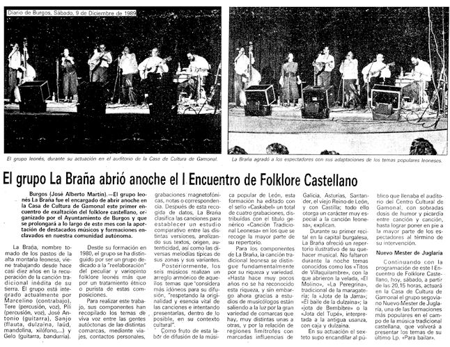 El grupo leonés "La Braña" fue el encargado de abrir anoche en la Casa de Cultura de Gamonal este primer encuentro de exaltación del folklore castellano [sic]*, organizado por el Ayuntamiento de Burgos y que se prolongará a lo largo de este mes con la aportación de destacados músicos y formaciones enclavados en nuestra comunidad autónoma.