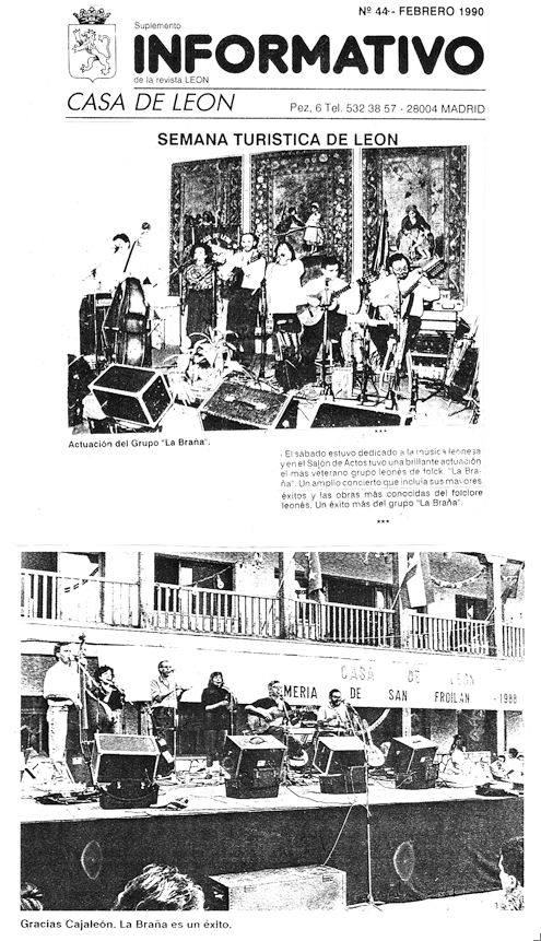Pies de foto: Actuación del grupo "La Braña" (1990) Gracias, Cajaleón. La Braña es un éxito (1988)