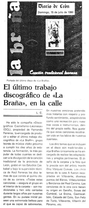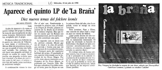 Ha sido la compañía "Discografía Castellano-Leonesa" (DCL), propiedad de Fernando Ferreras, la encargada de producir y editar el último trabajo discográfico de "La Braña", grupo leonés de música folk próximo a cumplir los diez años de existencia. La formación, la más popular de todas cuantas se dedican a la divulgación de la canción tradicional de la provincia de León, grabó en los Estudios Caskabel y bajo la supervisión técnica de Raúl Ferreras los diez temas de que consta el quinto disco de su carrera. "Todas estas canciones -asegura el grupo en el interior de la carpeta- son tradicionales y han sido cantadas durante largos años por nuestras gentes. En su pureza inicial poseen una extremada belleza para el que es capaz de saborearlas.