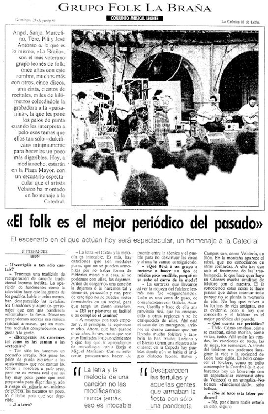 Angel, Sanjo, Marcelino, Tere, Pili y José Antonio o, lo que es lo mismo, "La Braña", son el más veterano grupo leonés de folk; once años con este nombre, muchos más con otros, cinco discos, una cinta, cientos de recitales, miles de kilómetros colocándole la grabadora a la "paisanina", la que les pone los pelos de punta cuando les interpreta a pelo esos temas que ellos tan sólo "dulcifican" mínimamente para hacerlos un poco más digeribles. Hoy, a medianoche, estarán en la Plaza Mayor, con un escenario espectacular que el artista Velasco ha montado en homenaje a la catedral.