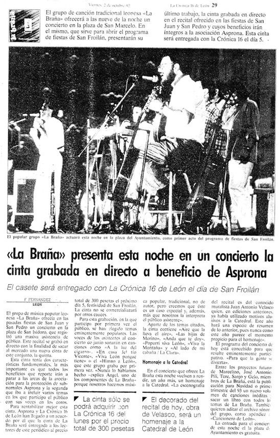 Para esta grabación, en la que participa por primera vez el público, se han elegido temas eminentemente populares. Las voces de los asistentes al concierto de junio sonarán en canciones como "A la luz del cigarro", "En casa del tío Vicente", "Viva León porque tiene", o el "Himno a León", que este grupo graba por primera vez. "Nunca lo habíamos hecho -explica Ángel, uno de los componentes de La Braña- porque nosotros hacemos música popular, tradicional, no de autor, pero creemos que éste es un caso especial y, además, más que nosotros la interpreta el público asistente".