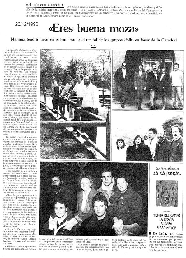 Los cuatro grupos existentes en León dedicados a la recopilación, cuidado y difusión de la música autóctona de la provincia -"La Braña", "Aldaba", "Plaza Mayor" y "Hierba del Campo"- se convertirán mañana, a partir de las doce, en protagonistas de un concierto "histórico" e inédito, que, a beneficio de la Catedral de León, tendrá lugar en el Teatro Emperador.
