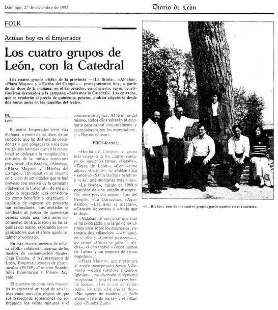 El teatro Emperador sirve esta mañana, a partir de las doce, de un concierto que no disfruta de precedentes y que congregará a los cuatro grupos leoneses que en la actualidad se dedican a la recopilación y difusión de la música autóctona provincial: "La Braña", "Aldaba", "Plaza Mayor" y "Hierba del Campo". Tal iniciativa se inscribe en el ciclo de actividades que se han previsto con motivo de la campaña "Salvemos la Catedral", de ahí que todo lo recaudado será considerado como beneficio y engrosará el capítulo de ingresos de proyecto tan estimulante. Las entradas se venderán al precio de quinientas pesetas desde una hora antes del comienzo de la actuación en las taquillas del teatro, esperando los organizadores que el aforo quede totalmente colmado.