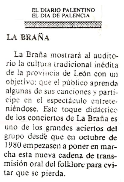 La Braña mostrará al auditorio la cultura tradicional inédita de la provincia de León con un objetivo: que el público aprenda alguna de sus canciones y participe en el espectáculo entreteniéndose. Este toque didáctico de los conciertos de La Braña es uno de los grandes aciertos del grupo desde que en octubre de 1980 empezasen a poner en marcha esta nueva cadena de transmisión oral del folklore para evitar que se pierda.