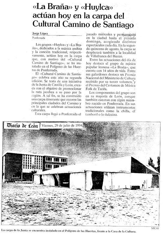 Los grupos "Huylca" y "La Braña", dedicados a la música andina y a la canción tradicional, respectivamente, actúan hoy en la carpa que, con motivo del "Cultural Camino de Santiago", se ha instalado en el Polígono de las Huertas de Ponferrada.