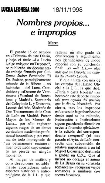 El pasado 15 de octubre en "Tribuna" de este Diario, y bajo el título "La Lucha ¿Algo más que un deporte?, se publicaba un documentado trabajo firmado por Guillermo Suárez Fernández. El Dr. Suárez, paradójicamente oriundo de la Ribera -no luchística- del Luna, catedrático y exdecano de Veterinaria (Facultad de Barcelona y Madrid), Secretario del Colegio de L. y Doctores, Leonés del Año, Madreña de Oro Transmontana de la Casa de León en Madrid, Pastor Mayor de los Montes de Luna... por sólo registrar algunos rasgos de un denso curriculum académico profesional honorífico; y por encima de todo impregnado de un permanente enamoramiento de León, cuyo contacto no pierde en ningún momento.