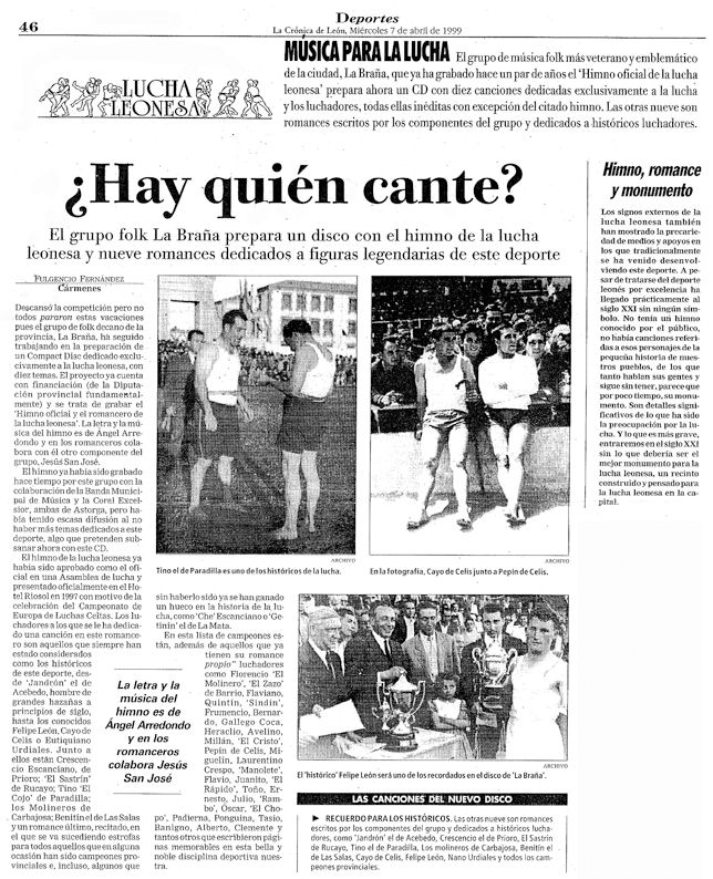 EL GRUPO FOLK LA BRAÑA PREPARA UN DISCO CON EL HIMNO DE LA LUCHA LEONESA Y NUEVE ROMANCES DEDICADOS A FIGURAS LEGENDARIAS DE ESTE DEPORTE