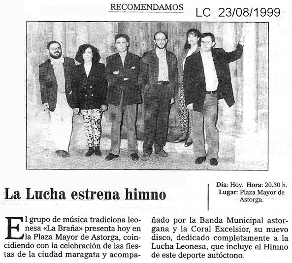 ...Y descendiendo un escalón más en las escalas de la concreción luchística, el ilustrativo dato que pretendíamos aportar la semana pasada y que apareció deslavazado por un salto de línea: que se hubiese de recurrir a la Banda Municipal de Astorga para acompañar a "La Braña" en la grabación del Himno a la Lucha Leonesa ante la no disponibilidad de la de León capital. Algo más que una significativa anécdota por lo que tiene de eso, de significativamente ilustrativo....