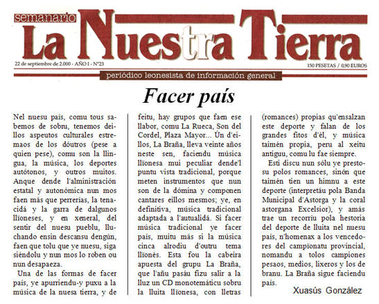...Una de las formas de facer país, ye apurriendu-y puxu a la música de la nuesa tierra, y de feitu, hay grupos que faen ese llabor, comu La Rueca, Son del Cordel, Plaza Mayor... Ún d'eillos, La Braña, lleva veinte años neste sen, faciendu música llïonesa mui peculiar dende'l puntu vista tradicional, porque meten instrumentos que nun son de la dómina y componen cantares eillos mesmos;