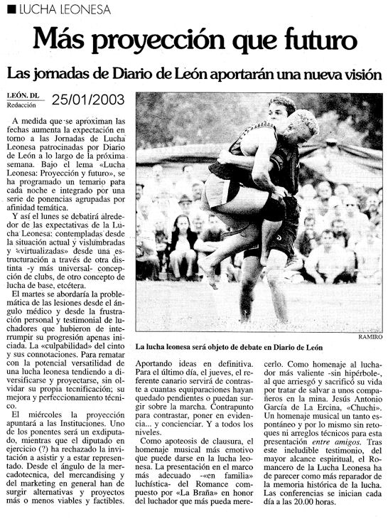 La actualidad luchística está viniendo marcada apor esas "Primeras Jornadas Científicas de lucha leonesa: Proyección y Futuro" auspiciadas por Diario de León y a celebrar en su Club de Prensa -Gran Via de San Marcos 8- durante los próximos 27, 28, 29 y 30. A partir de las 8 de la noche y con entrada libre hasta completar el aforo; se impone, pues, acudir con tiempo. A través de las distintas ponencias del temario programado para cada noche, las que se suscitarán han de ser aportaciones en clave de I + D...+ I. Desde la óptica de la lucha leonesa: Investigación más Desarrollo... más Innovación. Aportes con vocación creativa. Planteamientos con imaginación y riesgos. Frente a "saltitos de vuelo corto" (exhibiciones provincianas, seudocampeonatos seudoeuropeos de seudoluchacelta y cosillas así), programas de alcance, repercusión y trascendencia luchísticos. Y con remate de coloquio abierto cada noche para que no quede nada al aire.