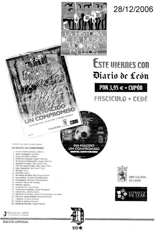 HA NACIDO UN COMPROMISO 1. A mí lo mismo me da. La Braña 2. Boda maragata. La Braña 3. Cayo de Celis. La Braña 4. Podemos empezar. Ángel y Merche 5. Te haces al deshacerte. Ángel y Merche 6. Apagad el fuego. Tista, Sara y Toño 7. Con las varas al cielo. Tista, Sara y Toño 9. Astorga. Isaac 10. Lamento. Isaac 11. Banderas de Abril. Miguel Escanciano 12. Los profetas. Ricardo Cantalapiedra 13. El peregrino. Ricardo Cantalapiedra 14. Cuento. Hierba del Campo 15. Palmira. Aldaba 16. Tú eres la flor. Plaza Mayor 17. Y por eso lo mataron. Javier Rodríguez 18. Chumi-Chu. Alberto Morán 19. Madre la mi madre. Buenas Noticias/Barrio Húmedo 20. Swin low, sweet charriot. Buenas Noticias 21. I believe. Gordon & Uriarte 22. Franky & Johnny. Chusma. 23. House on the rain. Capas pardas.
