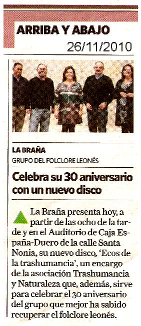 Δ La Braña presenta hoy, a partir de las ocho de las tarde y en el Auditorio de Caja España-Duero de la calle Santa Nonia, su nuevo disco, 'Ecos de la trashumancia', un encargo de la asociación Trashumancia y naturaleza que, además, sirve para celebrar el 30 aniversario del grupo que mejor ha sabido recuperar el folclore leonés.