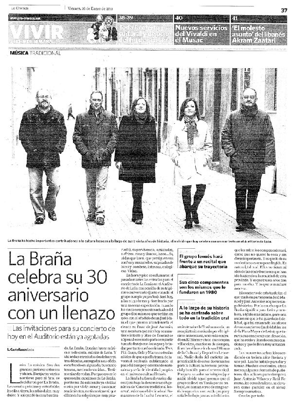 León. La música. Sus dos grandes pasiones entonces y ahora. Barajaron varios nombres pero al final se decidieron por La Braña. Les sonaba próximo y entrañable; les olía a tierra; les sabía dulce, muy dulce. Y así quedó la cosa bautizada: La Braña. Querían hacer música a toda costa, música de León. Y ahí andan enredados desde hace ya tres décadas, entregados a su oficio, escarbando en el pasado, buscando tesoros, meciendo sonidos... Testimoniando vidas. Porque eso es lo que son las canciones de La Braña, porciones de existencia ya vividas o aún por vivir: amor y desamor, sentimientos, erotismo (que sí, que el leonés ha sido siempre muy picaruelo), supervivencia, amistades, sufrires, risas y llantos, lazos... Sí, vidas que laten, que persiguen sus sueños y sus anhelos, salpicadas de luces y sombras, intensas, enérgicas. Vidas.