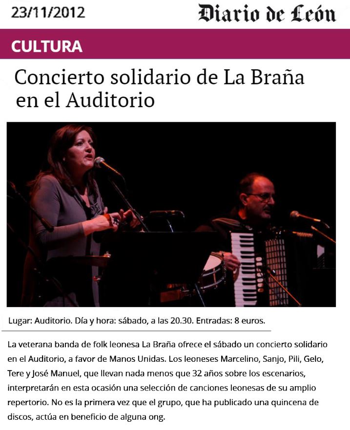La veterana banda de folk leonesa La Braña ofrece el sábado un concierto solidario en el Auditorio, a favor de Manos Unidas. Los leoneses Marcelino, Sanjo, Pili, Gelo y Tere, que llevan nada menos que 32 años sobre los escenarios, interpretarán en esta ocasión una selección de canciones leonesas de su amplio repertorio. No es la primera vez que el grupo, que ha publicado una quincena de discos, actúa en beneficio de alguna ong.