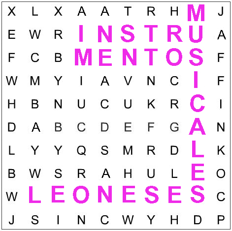En esta sopa de letras encontrarás los nombres de 10 instrumentos tradicionales representativos de la música leonesa. Profundización: Busca en Internet fotos y descripciones de estos instrumentos y realiza un pequeño trabajo o presentación. |
